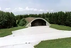 (MiG-Shelter Typ GDF, links 1 × offen, rechts 2 × geschlossen, ganz rechts Munitionsbunker)