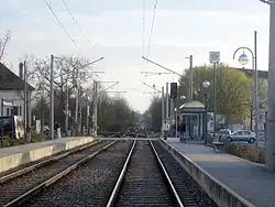 Am 3. Juni 1989 wurde die Linie A schließlich bis nach Hochstetten verlängert.[10] Die ursprünglichen Planungen hatten vorgesehen, ab Leopoldshafen zunächst wieder die alte Trasse zu verwenden, um anschließend sowohl Linkenheim als auch Hochstetten mittels einer neuen Trasse besser zu erschließen. Letztendlich wurde die neue Strecke komplett durch die Ortsmitte von Linkenheim auf der vormaligen Bundesstraße 36 gebaut, die auf eine Umgehungsstraße verlegt worden war, was bis heute immer wieder aufgrund der beengten Platzverhältnisse im Ortskern für Konflikte mit dem Individualverkehr sorgt.[10]