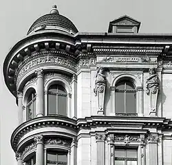 An der stark gegliederten Sandsteinfassade wechseln etagenweise hohe Rechteck- und Bogenfenster mit aufwändig geschmückten Fensterüberdachungen in der ersten und zweiten Etage. Blickfang sind der Runderker und die benachbarten als flache Lisenen hervortretenden Fensterachsen. Am dreiachsigen Erker werden die Fenster durch kannelierte Dreiviertelsäulen getrennt. Darüber erhebt sich ein kleiner Turmaufbau mit einer schiefergedeckten Rundkuppel. Das die gesamte Fassade begleitende breite Hauptgesims ist mit kräftigem Zahnschnitt versehen. der nur an den Lisenen neben dem Erker unterbrochen wird, wo Karyatiden ein Gebälk mit dem Erbauungsjahr tragen. Auf dem Satteldach ist in dem hofseitigen Winkel ein balkonartiger Austritt angebracht, er bei der Sanierung 1995 entstanden sein dürfte.[6] Im Inneren sind unter anderem der Eingangsbereich mit Säulen und einer prachtvollen Deckenmalerei sowie die gusseiserne Treppenanlage erhalten.