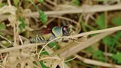 - Harlekinschrecke: Zonocerus variegatus (Linnaeus, 1758); Zonocerus variegatus tritt dimorph auf, als kurzflügelige und als langflügelige Form.[11]