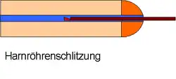 - Harnröhrenschlitzung (Urethrotomie): Hier wird mit einem Urethrotom in die Harnröhre unter Sicht (Methode nach Sachse) oder blind (Methode nach Otis) in die Harnröhre eingegangen und diese bei 12 Uhr mit einem Messer geschlitzt. Anschließend wird ein Blasenkatheter eingelegt. Dieser verbleibt für einige Tage, und nach Entfernung kann zur Verhinderung eines Wiederauftretens (Rezidiv) ein kortisonhaltiges Gel in die Harnröhre gespritzt werden.