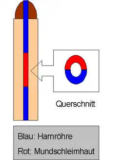 - Mundschleimhautplastik: Nach ein- bis zweimaligem Schlitzen und Wiederauftreten einer Harnröhrenstriktur oder bei sehr langstreckigen Strikturen wird eine Erweiterung der Harnröhre durch Einnähen eines Stückes Mundschleimhaut vorgenommen. Dazu wird die Harnröhre von außen dargestellt und über der Striktur längs eröffnet. Jetzt wird ein Stück Mundschleimhaut von entsprechender Größe entweder aus der Unterlippe oder von der Wange entnommen und eingenäht. Anschließend wird auch hier ein Blasenkatheter gelegt. Zusätzlich wird ein Bauchdeckenkatheter in die Blase eingebracht. Der Blasenkatheter dient der Schienung und dem Offenhalten der Harnröhre. Der Bauchdeckenkatheter dient der Blasenentleerung. Der Blasenkatheter wird nach ca. acht Tagen entfernt. Der Bauchdeckenkatheter verbleibt für ca. drei Wochen. Nach dieser Zeit wird eine Röntgenuntersuchung mit Kontrastmittel durchgeführt. Hierbei wird die Blase gefüllt und der Patient anschließend zum Wasserlassen aufgefordert. Ist dieses problemlos möglich und liegt eine vollständige Blasenentleerung vor, wird der Bauchdeckenkatheter entfernt.
