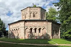 Das außergewöhnliche eingeschossige und denkmalgeschützte Bauwerk besteht aus zwei übereinanderliegenden oktogonalen achsgleichen Prismen. Es weist Elemente der Neoromanik und orientalischer Bauten auf. Darunter befindet sich die mit schwarzem Marmor verkleidete Krypta mit den Särgen der Grafen Harrach zu Rohrau und Thannhausen, in der auf Tafeln in Goldschrift die Namen und Titel der Beigesetzten eingelassen wurden.