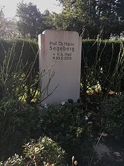 Seine letzte Ruhestätte erhielt Harro Segeberg auf dem Friedhof Ohlsdorf. Sie liegt südlich von Kapelle 10 im Planquadrat K 30.