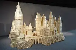 Für die Zauberschule Hogwarts wurden mehrere Drehorte gewählt, damit der Eindruck aufrechterhalten bleibt, dass das Zauber-Internat nicht an einem realen Ort untergebracht ist.[37] Die Mauern von Alnwick Castle stellten die Außenansicht, seine langgezogenen, flachen Grünflächen das Quidditch-Feld. Aufnahmen für die Gänge und Flure stammen aus den Kreuzgängen der Abtei von Lacock,[38] der Kathedrale von Gloucester und der Kathedrale von Durham. Die Wärmestube der Erstgenannten lieferte außerdem die Kulisse für das Unterrichtszimmer von Professor Quirrel, der Kapitelsaal der Letzteren das von Professor McGonagall.[3] Das Zimmer von Professor Flitwick befindet sich dagegen in der englischen Schule Harrow.[3][4][36] Verschiedene Gebäude der Universität Oxford trugen ebenfalls zur Filmarchitektur von Hogwarts bei: Die Duke Humfrey’s Library, ein Teil der Bodleian Library, repräsentiert die Bibliothek der Zauberschule, die Divinity School ihr Spital und das College Christ Church den Trophäenraum.[39][40]