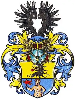 Blasonierung: Geteilt. Oben in Gold ein schwarzer Adlerkopf. Unten in Blau ein nackter Mann, der aus dem Schildfuß hervorwächst, die Linke eingestemmt, in der Rechten eine brennende schwarze Fackel. Auf dem Helm mit blau-goldenen Helmdecken ein offener schwarzer Flug.[3]
