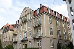 Das Mietshaus wurde im Jahr 1911 vom Bad Kissinger Architekten Franz Krampf im späten Jugendstil errichtet. Bei dem Anwesen handelt es sich um einen dreigeschossigen Mansardwalmdachbau mit bossiertem Sockel und geschwungenem Mittelgiebel. Das Mansarddach und der geschwungene Mittelgiebel des Anwesens sind charakteristische Elemente für den Jugendstil. Die strenge Symmetrie und eine gewisse Sprödigkeit der Fassade deuten auf dessen Spätphase mit einem stärker werdenden klassizisierenden Zug hin.