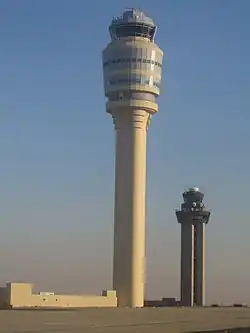 Der heutige Tower des Flughafens wurde zusammen mit der fünften Start- und Landebahn zwischen 2001 und 2006 errichtet, um auch diese fünfte Bahn in voller Länge überblicken zu können. Er ist mit 121 Metern Höhe der größte in den USA und der viertgrößte der Welt.[3] Der größte der Welt ist 132 m hoch und befindet sich am Flughafen Bangkok-Suvarnabhumi.