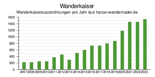 Das System erfreut sich außerordentlich großer Beliebtheit, und die Nachfrage steigt weiterhin an.[15] Allein im Jahre 2006 wurden etwa 10.000 Wanderpässe verkauft.[16] Im Jahr 2015 wurden fast 20.000 Wanderpässe neu ausgegeben.[17] Die Anzahl der jährlich verkauften Wanderpässe stieg bis 2019 auf 50.000 und hat 2020 die Anzahl 90.000 erreicht.[18][19] Bemerkenswert ist auch, dass es in jedem Jahr bis 2019 eine dreistellige, seit 2020 eine vierstellige Zahl an Wanderern gibt, die sich den „Harzer Wanderkaiser“ erwandern. Im Jahr 2022 wurde die 9000. Wanderkaiser-Auszeichnung seit der Einführung der Wandernadel vergeben.[20] Da die Stempelstellen auf eine etwa 2500 Quadratkilometer große Fläche verteilt sind,[21] sind zum Erwerb dieses Titels umfangreiche Wanderungen erforderlich.