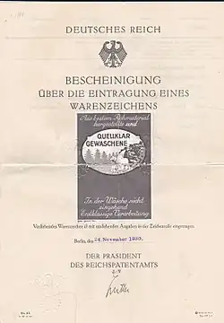 Das im Februar 1930 eingetragene Warenzeichen berief sich mit „Quellklar gewaschen“ auf die eigene Quelle, während das im Etikett abgebildete Schaf immer noch die teilweise Verarbeitung dessen Wolle gemäß dem Hygiene-System von Dr. Carl Jäger symbolisierte.[13]