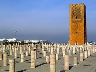 | Hassan-Turm. Im Vordergrund Reste der Stampflehm-Außenwände der Moschee | |