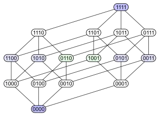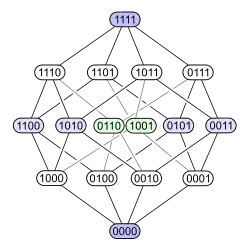 Die -elementige Potenzmenge einer -elementigen Menge mit der Mengeninklusion lässt sich als Hasse-Diagramm darstellen. Dabei bilden die Elemente von die Knoten. Das durch den untersten Knoten dargestellte Element (leere Menge) ist eine Teilmenge aller Elemente von ; das durch den obersten Knoten dargestellte Element ist eine Obermenge aller Elemente von .