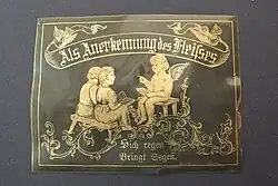 - ↑ Marion Widmann: Ohne Fleiß kein Preis. Preisbücher, Fleißbildchen und Tatzen. In: Vater, Mutter, Kind. Bilder und Zeugnisse aus zwei Jahrhunderten.Katalog zur Ausstellung. Münchner Stadtmuseum, München 1987, S. 314–319, ISBN 3-7991-6381-6, S. 318.