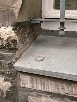 Als Hauerbuckel wurden in früheren Zeiten oft eingeschlagene, meist verzinkte sogenannte 'Dachpappennägel" (Nägel mit breitem, flachen Kopf) benutzt. Oft wurden unter dem zu befestigenden Blech Drähte an den Hauerbuckeln (oder Dachpappennägeln) angebracht, welche z. B. bei Rohbauten an im Mauerziegel eingeschlagenen Nägeln befestigt wurden. Nägel und Draht wurden dann eingeputzt. Die Befestigungen mit Hauerbuckel-Abdeckungen sind jedoch nur bei geringen thermischen Längenänderungen und damit bei kleinformatigen Blechen sicher.[1] Sie wurden besonders bei älteren Blechabdeckungen von Fensterbänken, Gesimsabdeckungen und kleineren gemauerten Balkonbrüstungen bis in die 60er Jahre verwendet und sind heute überwiegend durch Befestigungen mit Haften oder indirekte Befestigungen ersetzt, wobei sich der Begriff Hauerbuckel auch auf spezielle Schrauben aus Kupfer oder anderen Metallen erhalten hat, welche kein Regenwasser durchlassen.
