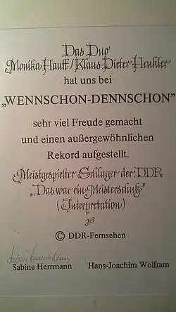 2. „Allein 1975 haben Hauff/Henkler beachtliche internationale Erfolgsbeweise nach Hause gebracht: den 1. Preis in der Publikumswertung vom Schlagerfestival in Ljubljana, gemeinsam mit Frank Schöbel und Aurora Lacasa den Sonderpreis vom „Coup d'Europe Musicale“ in Österreich und als Krönung den „Grand Prix de la chanson de Paris“, eine Trophäe, um die sich 30 Länder beworben hatten.“ Neue Berliner Illustrierte, Ausgaben 27–53, 1975, S. 30, auf Google Books („H & H in Golzow“); Chronik der DDR 1975, abgerufen am 8. Februar 2015