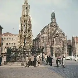 An der Ostseite des Hauptmarktes wurde ab 1352 die Frauenkirche errichtet. Sie befindet sich dort, wo vor dem Pogrom von 1349 die Synagoge des Judenviertels stand. Die „Männleinlaufen“ genannte Kunstuhr an der dem Hauptmarkt zugewandten Westfassade des Gebäudes, die an den Erlass der Goldenen Bulle erinnert, zählt zu den wichtigsten Sehenswürdigkeiten der Stadt.