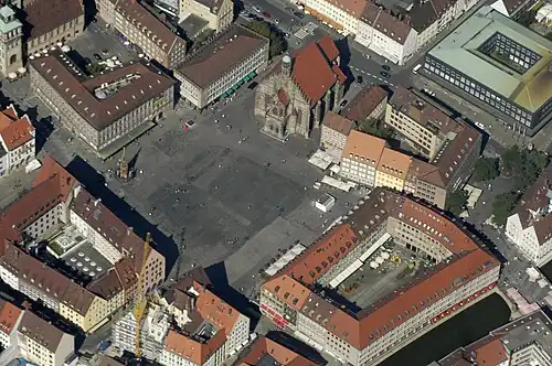 Am nordwestlichen Rand des Platzes befinden sich die Sebalduskirche und der Wolff’sche Bau des Nürnberger Rathauses.