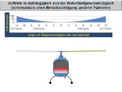 Da der dynamische Auftrieb bei gleichem Anstellwinkel der Rotorblätter quadratisch zur Anströmgeschwindigkeit (im Schwebeflug bei Windstille ungefähr identisch mit der Rotorblattgeschwindigkeit) zu- bzw. abnimmt, ist der Auftrieb im Schwebeflug (ohne Berücksichtigung anderer Faktoren) an den Rotorblattspitzen viermal größer als am halben Rotorkreis.[10]
