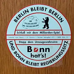 Für Bonn sprach einerseits, dass sowohl die alliierten Siegermächte als auch viele Deutsche Bedenken hatten, ob das ehemalige Machtzentrum des „Dritten Reiches“ als politische Zentrale des neuen demokratischen Deutschlands geeignet sei.[5] Zudem wurde angeführt, dass der Umzug nach Berlin dem Bund hohe Kosten verursachen würde und man dieses Geld besser in den Aufbau der neuen Bundesländer investieren könne.[5][4] Ein weiteres Argument war die nationale Symbolik der beiden Städte; dabei stand Bonn für Bescheidenheit und demokratische Verlässlichkeit, während Berlin für Größenwahn und eine obrigkeitshörige Staatsauffassung stand.[5] Zudem hatte Bonn schon lange den Status der provisorischen Hauptstadt abgelegt, da sich die meisten Akteure an Bonn als Hauptstadt gewöhnt hatten.[4] Weitere Argumente waren unter anderem, Bonn verkörpere das föderalistische Prinzip Deutschlands, Bonn sei verbunden mit einem Neuanfang der deutschen Demokratie und der längsten friedlichen Zeit Deutschlands und die Westbindung und die europäische Einigung seien erfolgreich von Bonn aus vorangetrieben worden.[5][4]