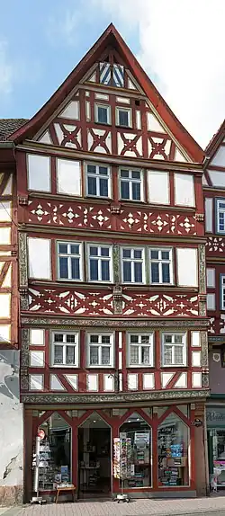 Das spätgotische giebelständige Haus mit vier Fensterachsen besitzt einen reichen Dekor. Im ersten Obergeschoss sind Flachschnitzereien mit Masken, Ranken und Flechtbändern am Rahmen zu sehen. Im zweiten und dritten Obergeschoss besteht das Zierfachwerk aus Feuerböcken und Rauten. Die Rückseite des Hauses ist bis zum zweiten Obergeschoss massiv ausgeführt. Dort sind Fenstergewände und Gesimsreste aus Sandstein vorhanden.