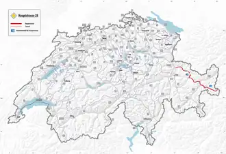 Die heutige Hauptstrasse 28 beginnt in Landquart. Durch das Prättigau geht es nach Klosters, über den Wolfgangpass nach Davos, über den Flüelapass ins Engadin und weiter durch den Schweizer Nationalpark, über den Ofenpass und durch das Münstertal nach Müstair an der Grenze zum italienischen Südtirol.