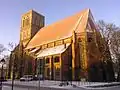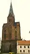 dreischiffige Basilika ohne Querschiff und mächtigem Turm, nach Beschädigungen im Zweiten Weltkrieg wurde die Kirche 1960 gesprengt, Turm erhalten | ![]() | |