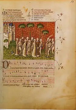 Guillaume de Machaut: Werke[18] | um 1355–1360 | Frankreich: Paris | ein Mitglied des Hofes in Paris | Guillaume de Machaut: Werke; 104 Miniaturen | Paris, Bibliothèque nationale, Ms. fr. 1586 | |