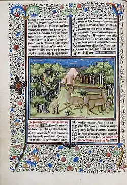 Gaston Phoebus: Das Buch der Jagd[38][39] | um 1405–1410 | Frankreich: Paris | mindestens drei Künstler | Johann Ohnefurcht | Gaston Phoebus: „Das Buch der Jagd“; 87 Miniaturen | Paris, Bibliothèque nationale, Ms. fr. 616 |