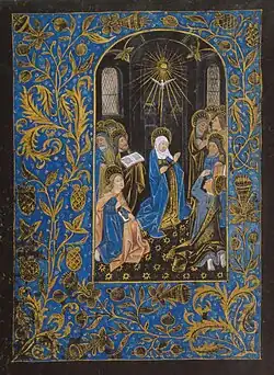 Très Belles Heures de Notre-Dame[36][37] | um 1380, ca. 1404-1409, um 1412 | Frankreich: Paris (1378-1280), Bourges (1400-1405) | Jean d'Orléans (zwischen 1361 und 1407 nachgewiesen) und Gehilfen, Meister des Heiligen Geistes, Meister Johannes des Täufers | Jean de Berry | Fragment eines Stundenbuchs mit Teilen eines Missales; 26 Bildseiten | Paris, Bibliothèque nationale, NAL 3093 |