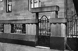 Anstelle der Hauptgesimse wurden „durchlaufende […] Gurte mit […] Kettenmotiv“[8] gesetzt. Das Haus wies Doppelgiebel auf, die mit figürlichem Bauschmuck des Berliner Bildhauers Adolf Amberg verziert waren. In die Doppelgiebel wurden Vertikalbänder aus getriebenen Kupfereinlagen gesetzt. Die repräsentative Gestaltung des Hauses nahm Bezug auf die nur wenige Jahre zuvor errichtete, gegenüberliegende Friedenskirche.[9] Ein außen befindlicher Treppenaufgang führte direkt zu den Obergeschossen.[10]