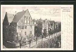 - ↑ „Das schöne Sandsteinmaterial mit dem figuralen Schmuck der Giebel, letzterer von Bildhauer Adolf Amberg-Berlin - die Vertikalbänder sind durch getriebene Kupfereinlagen belebt - steigert naturgemäß die Vornehmheit und das Ebenmaß dieses Baus, der eine seiner Umgebung - auf dem Platze befindet sich eine neue romanische Kirche (Friedenskirche) entsprechende Note erhalten mußte. Die Doppelgiebel markieren die Lage des Hauses“. (Quelle: Der Profanbau, 3. Jahrgang 1907, S. 293.)