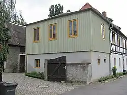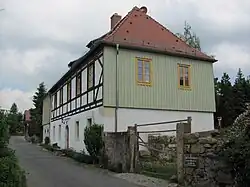 Haus Gebauer mit Hochwassermarke (rechts unten)