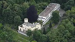Die längs zum Rhein mit Aussichtsterrasse gestellte Villa ist im Stil der Neugotik ausgeführt. Sie wird im Erdgeschoss mit mehreren Räumen für Gruppentreffen genutzt. Die ursprünglich dem Dach aufgesetzten Zinnen sind bis auf die des Turms nachträglich zugemauert worden.[6] An die Villa schließt sich nach hinten ein langgestrecktes neuzeitliches modernes Tagungszentrum an, mit weiteren Gruppenräumen und einer Küche mit Speiseraum. Die oberen zwei Geschossen nehmen Gästezimmer auf.[7]