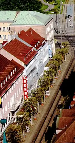 „Blick um 1940 in die Klostergasse nach Norden auf die Kaiserstraße, die im Hintergrund von links nach rechts verläuft. Auf der Nordseite der Kaiserstraße sieht man ein Geschäftshaus mit Erker und Türmchen, im Erdgeschoss die Gaststätte Stuttgarter Hofbräu (auf dem Bild nicht sichtbar) rechts das Schuhhaus Walch und links das Sportartikelhaus Saemann.“