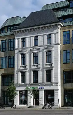 Die viergeschossige, verputzte, dreiachsige Fassade mit einem kräftigen Traufgesims ist der Überrest eines Kaufmannshauses, das 1857 in der Epoche Klassizismus für den Kaufmann Johann Heinrich Schmidt gebaut wurde. Die Fassade zeigt eine deutliche Teilung in Sockel-, Haupt- und Attikageschoß. Darüber deutet der Rest eines Walmdaches die frühere Dachform an, die aber heute deutlich steiler ist als früher.
