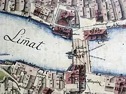 Der Raum zwischen den beiden Gebäuden war gegen den Fluss hin mit hölzernen Kramläden verstellt, die 1343 von einem Hochwasser weggerissen wurden: Anno Domini 1343, 24, July war die Lindmat also gross, dass sy zu Zürich das gross Hauss an der Nideren prucken (yetz (1548) zum Roten Schwärt) domals Herr Hans Müllern zugehörig, hinweg fürt, das zerstiess den Müllisteg und schwemmt drey mülli mit jm dahin.