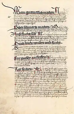 Die folgenden sechzehn Seiten fol. 26v–33r umfassen deutschsprachige Rezepte verschiedener Art. Von der Wundbehandlung mit Rezepten zur Blutstillung über Hilfe gegen Durchfall, Hämorrhoiden, Pest und andere Krankheiten bis zu einem Aphrodisiakum („Ein confect ut mulier petat coitum“, fol. 31v) reichen die Themen der medizinischen Rezepte, die die Sammlung anführt. Es folgen Rezepte für das Eisenhärten, das Färben von Stoffen, die – im bayerischen Raum auch schon um 1400 praktizierte und publizierte[18] – Fleckenreinigung („Ein wasser zuo flecken“), Hinweise zur Schädlingsbekämpfung und zwei Kochrezepte (ein Rezept für „ein gebackens“ und ein Rezept für Quarkeierpfannkuchen). Die entscheidenden Zutaten der Rezepte sind teilweise in hebräischer Schrift verschlüsselt.