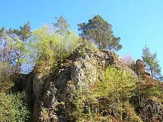 Direkt oberhalb von Hauseck befindet sich ein Felsriff, auf dem die verbliebenen Mauerreste der Burg Hauseck stehen.