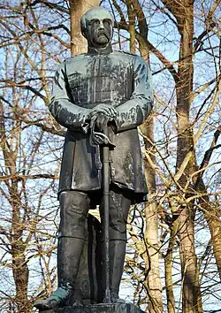 Nachdem der deutsche Reichskanzler Otto von Bismarck während seiner Kur in Bad Kissingen im Jahr 1874 ein Attentat durch den Böttchergesellen Eduard Franz Ludwig Kullmann überlebte, verlegte er seine Kuraufenthalte nach Hausen, wo er zwischen 1876 und 1893 14-mal kurte.[76][77] Bismarck sah seine Entscheidung für Hausen als neuen Kurort nach seinem Sieg über Bayern im „Deutschen Krieg“ als bewusste Geste der Versöhnung. Pächter der Oberen Saline und damit auch Bismarcks Gastgeber war der gebürtige Münnerstädter Karl Streit; eine tiefe Freundschaft entwickelte sich zwischen beiden Männern.[78] Zu Bismarcks Ehren wurde im Jahr 1877 noch zu Lebzeiten des Reichskanzler das Bismarck-Denkmal errichtet.[79][80][81][82] Als Bismarck im Jahr 1889 wegen dringender Amtsgeschäfte in Berlin nicht zur Kur nach Hausen kommen konnte, nutzte Kaiserin Auguste Viktoria seine Abwesenheit für einen eigenen Kuraufenthalt.[83] Ihr Verhältnis zu dem Reichskanzler hatte sich getrübt, als Friedrich VIII., Herzog der Herzogtümer Schleswig, Holstein und Lauenburg und Auguste Viktorias Vater, nach dem von Bismarck initiierten Deutsch-Dänischen Krieg von 1864 abdanken musste. Im Jahr 1893 entstand der Bildband Unser Bismarck des Hamburger Zeichners Christian Wilhelm Allers, als dieser den Reichskanzler mehrere Wochen lang auf seiner Kur begleitete.[84]