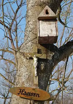 Im Ersten Weltkrieg fanden 27 Hausener Bürger den Tod.[19] Zu ihnen zählte auch der am 9. Juli 1896 geborene August Mantel, der als Ulan in den Krieg gezogen war und in Russland – nach dem Friedensschluss von Brest-Litowsk vom 3. März 1918 – am 16. März 1918 durch Folter (ob durch Zivilisten oder durch russische Soldaten, ist unklar) zu Tode kam.[98] An die Hausener Opfer des Krieges erinnerte ein heute nicht mehr existentes Denkmal auf dem Hausener Friedhof.[99]