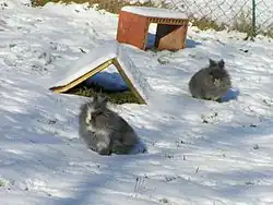 Die Haltung von Kaninchen sollte sich genau wie die Fütterung an den natürlichen Verhaltensmustern der Tiere orientieren. Kaninchen leben in freier Wildbahn in größeren Gruppen, zeigen eine ausgeprägte soziale Hierarchie und Revierverhalten; als Rückzugsraum dienen selbst gegrabene Höhlen. Ersatzweise können halb in die Erde eingegrabene Tontöpfe als Höhlen dienen, und aus handelsüblichen Abflussrohren lassen sich tolle Tunnellabyrinte bauen.[39] Die Haltung eines einzelnen Kaninchens ohne entsprechende Beschäftigung ist nach mancher Ansicht tierschutzwidrig. Für die häufig praktizierte Form der gemeinsamen Haltung eines Kaninchens und eines Meerschweinchens gilt diese Aussage ebenfalls (→ Kaninchen und andere Tiere).