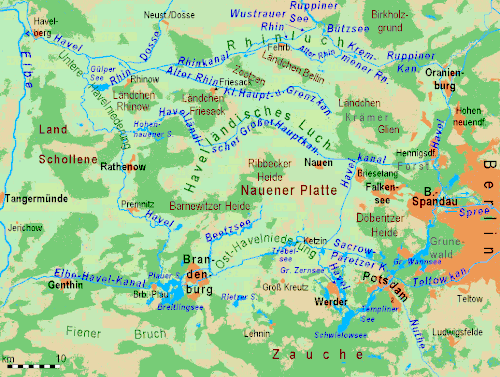 Die sandigen, trockenen Platten tragen außer Ackerland ausgedehnte Waldgebiete. Die größte ist die Nauener Platte. Nördlich davon gibt es mehrere Ländchen. Westlich des Havelbogens liegt das Land Schollene.