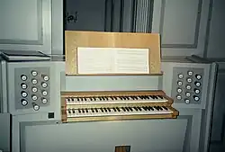 1854 wurde die Orgel von Marcussen & Søn generalüberholt, wobei die Sifflöte 1 1⁄3′ durch Fugara 4′ ersetzt wurde.[14] Im Oktober 1886 lieferte Marcussen & Søn eine neue Orgel mit acht Registern.[15] Das 3350 Goldmark teure Instrument hatte einen recht ausladenden Prospekt, wurde aber zuletzt sehr störanfällig. Daher erbauten 1958 Brødrene Bruhn eine neobarocke Orgel (II/P/16) mit einem Rückpositiv. Ihr Klang erwies sich jedoch nach einiger Zeit als zu flach und einseitig, auch war die Spielart schwergängig. Dem damaligen Organisten und Musikschulleiter Jes Lorenzen Solmer gelang es in den 1980er Jahren, beim Bitten & Mads Clausens Fond die Kosten (1,2 Millionen Dänische Kronen, zu der Zeit ca. 300.000 DM) für ein neues Instrument einzuwerben. So konnte 1987 die heutige Orgel von P. Bruhn & Søn erbaut werden.[16][17] Die Disposition, konzipiert von J. L. Solmer, dem Haderslebener Domorganisten Svend Prip und den Orgelbauern, lautet wie folgt:
