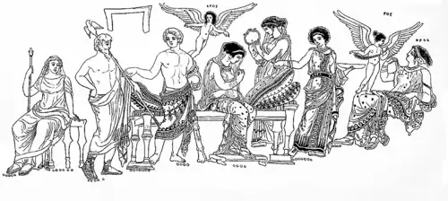 Hebe, „die mit den schönen Fesseln“ (καλλίσφυρον kallísphyron)[2] ist die Tochter von Zeus und Hera[3] und die Schwester des Ares, der Eileithyia und des Hephaistos.