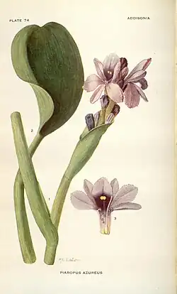 - ↑ a b c d e f g h i j k l m n o p q r s t u v w x y z aa ab ac ad ae af ag ah ai aj ak al am an ao ap aq ar as at au av aw ax ay az ba bb bc bd be bf bg bh bi bj bk bl bm bn bo bp bq br bs bt bu bv bw bx by bz ca cb cc cd ce cf cg Marco O. O. Pellegrini, Charles N. Horn, Rafael F. Almeida: Total evidence phylogeny of Pontederiaceae (Commelinales) sheds light on the necessity of its recircumscription and synopsis of Pontederia L. In: PhytoKeys, Volume 108, August 2018, S. 25–83. doi:10.3897/phytokeys.108.27652 online.