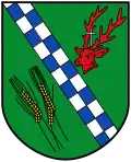 Blasonierung: „In Grün ein in Silber (Weiß) und Blau geschachter Schrägbalken; unten ein Bündel goldener (gelber) Getreideähren und oben ein rechtsgerichteter roter Hirschkopf, zwischen dem Geweih ein silbernes (weißes) Kreuz.“