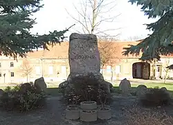 • Zum Gedenken an die Toten des Ersten Weltkriegs wurde auf dem jetzigen Denkmalplatz nach 1918 ein Kriegerdenkmal errichtet. Der dafür zugehauene Findling stammte von Schernbeckhof und wiegt etwa 35 Tonnen.[3] Das Denkmal besteht aus einem großen Granitblock in der Mitte und ist im Halbrund davor von kleinen Feldsteinen umgeben.[35]