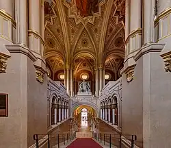 Die in der ersten Etage befindliche Ruhmeshalle ist mit Fresken von Karl von Blaas verziert. Sie entstanden in den Jahren von 1858 bis 1872 und zeigen die wichtigsten militärischen Ereignisse aus der Geschichte Österreichs seit den Babenbergern.[4] In den vier großen Wandbögen sind die Schlacht bei Nördlingen (1634), der Kriegsrat in der Schlacht bei St. Gotthard (1664), die Schlacht bei Zenta (1697) und der Entsatz von Turin (1706) dargestellt; im linken Nebensaal die Ereignisse aus der Regierungszeit Maria Theresias und Josephs II. bis zur Einnahme Belgrads 1789; im rechten Nebensaal die Napoleonischen Kriege von der Schlacht bei Würzburg 1796 über den Tiroler Volksaufstand von 1809 bis zu den Waffenstillstandsverhandlungen von Feldmarschall Radetzky mit König Vittorio Emanuele II. von Sardinien nach der Schlacht bei Novara 1849.