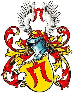 Blasonierung: In Gold eine rote Pferdepramme. Auf dem rot-golden bewulsteten Helm eine rote Pferdepramme zwischen einem offenen silbernen Flug.[2]