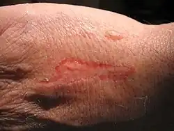 Flüssiger Heißkleber ist bis zu 200 °C heiß und verursacht beim Kontakt mit der Haut Verbrennungen. Der noch flüssige Heißkleber lässt sich nicht restlos von der Haut entfernen. Er sollte daher zunächst durch kaltes Wasser verfestigt werden.